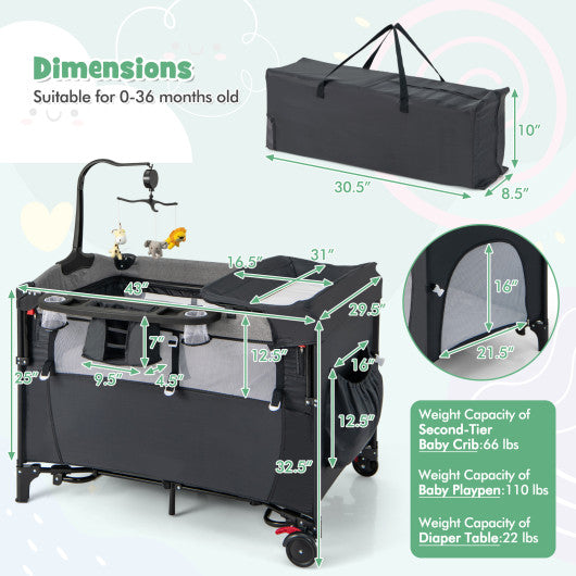 5-in-1 Baby Nursery Center Foldable Toddler Bedside Crib with Music Box-Black