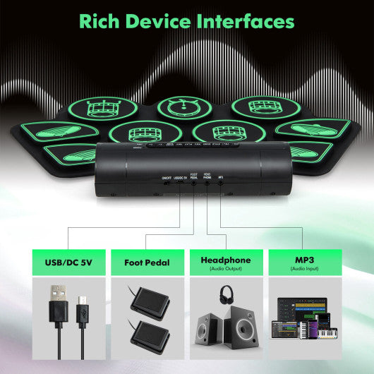 Electronic Drum Set with 2 Build-in Stereo Speakers for Kids-Green