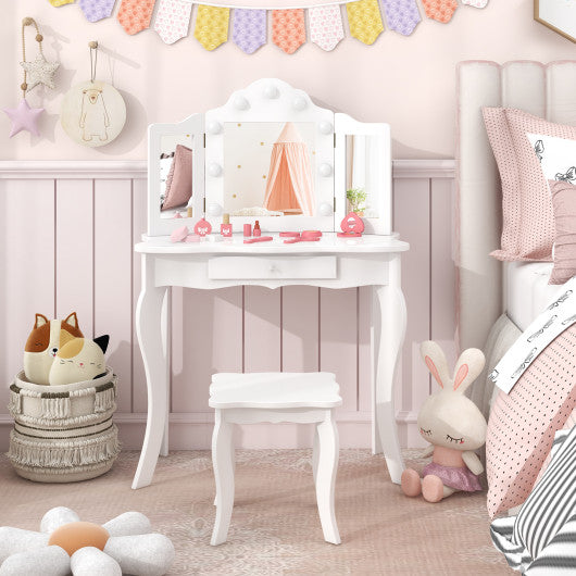 Kid Vanity Table Stool Set with Tri-Folding Mirror and 3-Color LED Lights-White