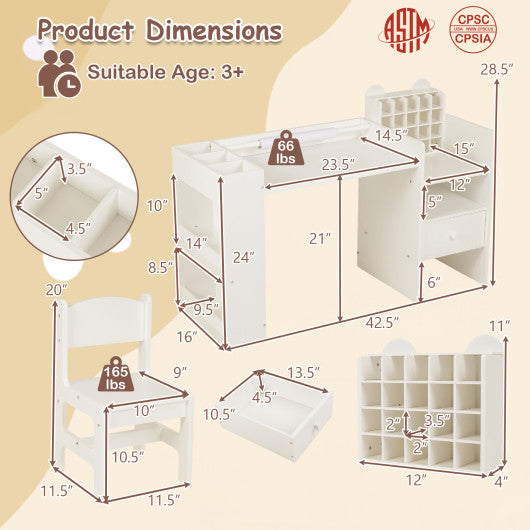 Kids Art Table and Chair Set with Detachable Paper Roll Holder and Cabinet-White