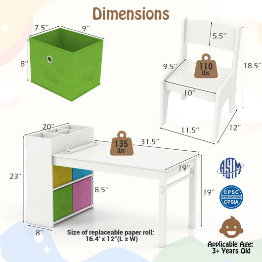 Kids Art Table and Chairs Set with 2 Chairs and Paper Roll-White