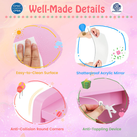 Kids Vanity Set with Lighted Mirror Makeup Desk and Chair Set with Drawers-Pink