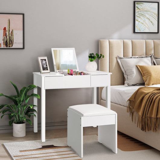 Vanity Makeup Dressing Table Set with Flip Top Mirror and Cushioned Stool-White